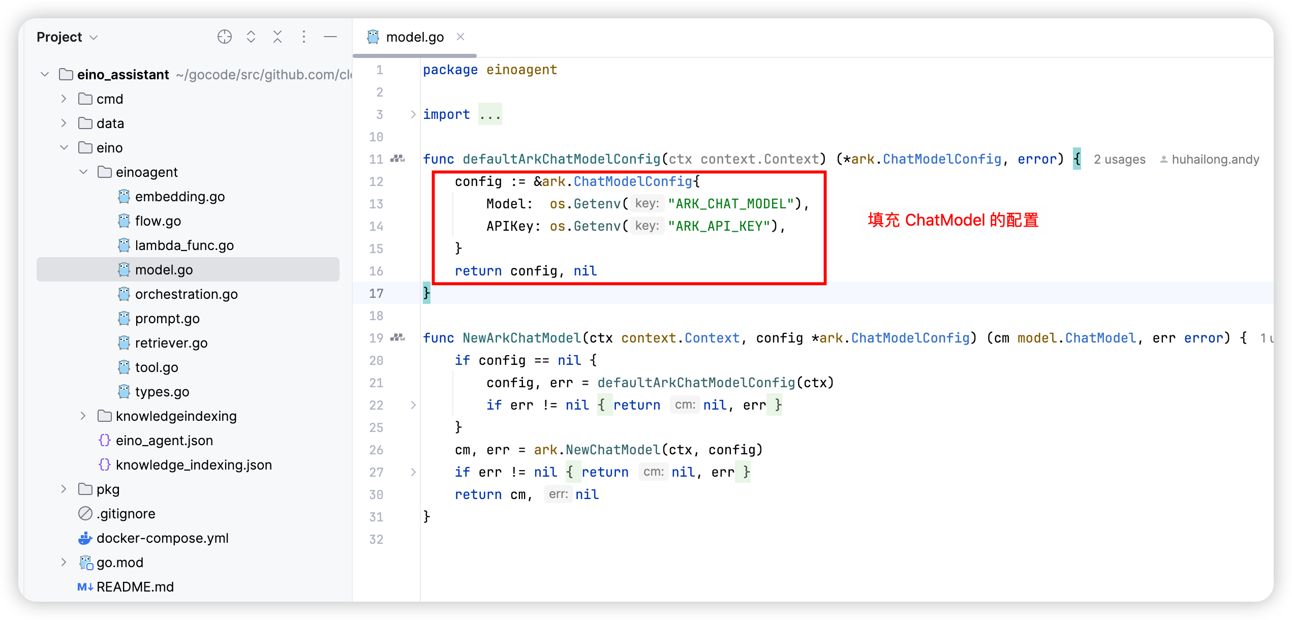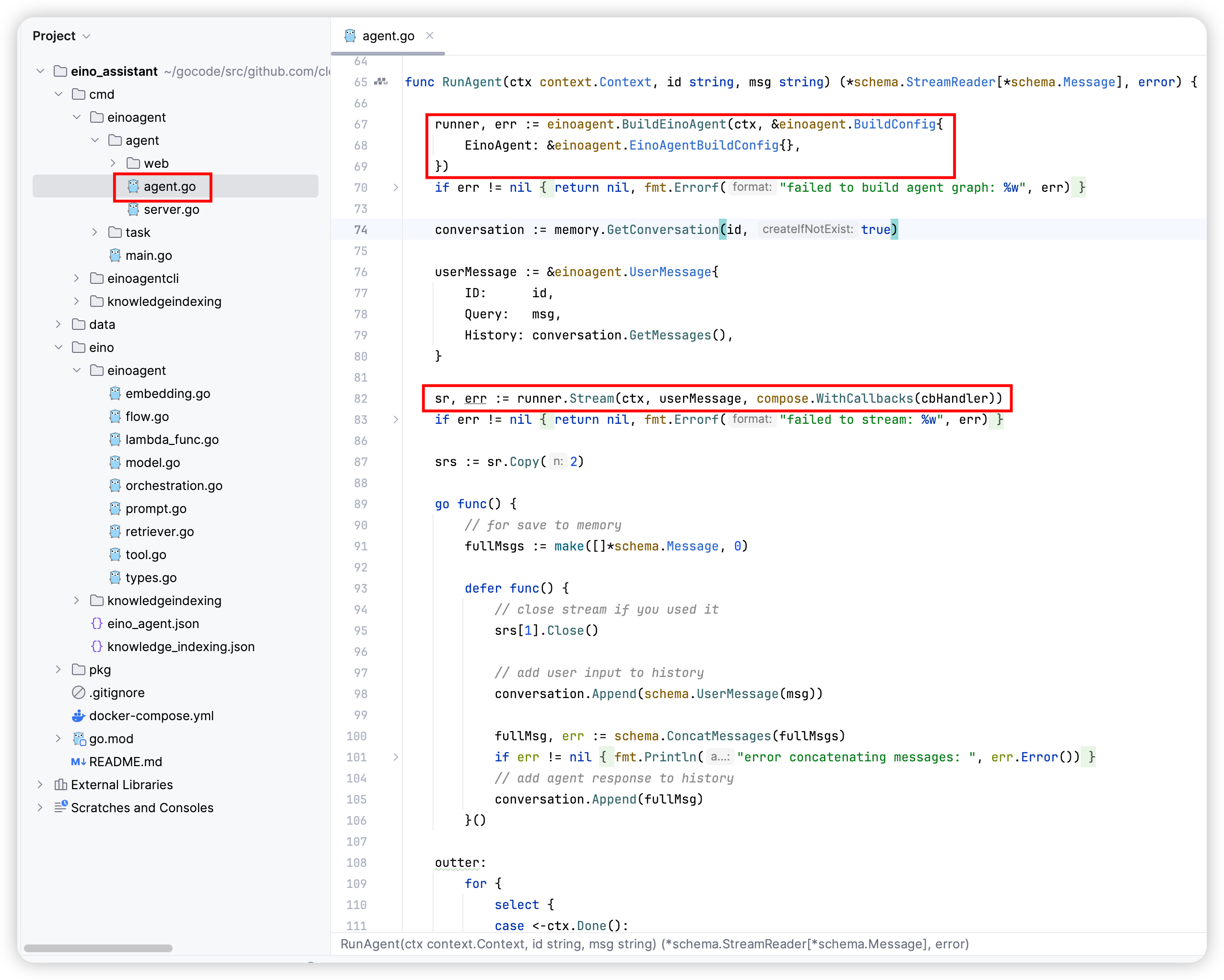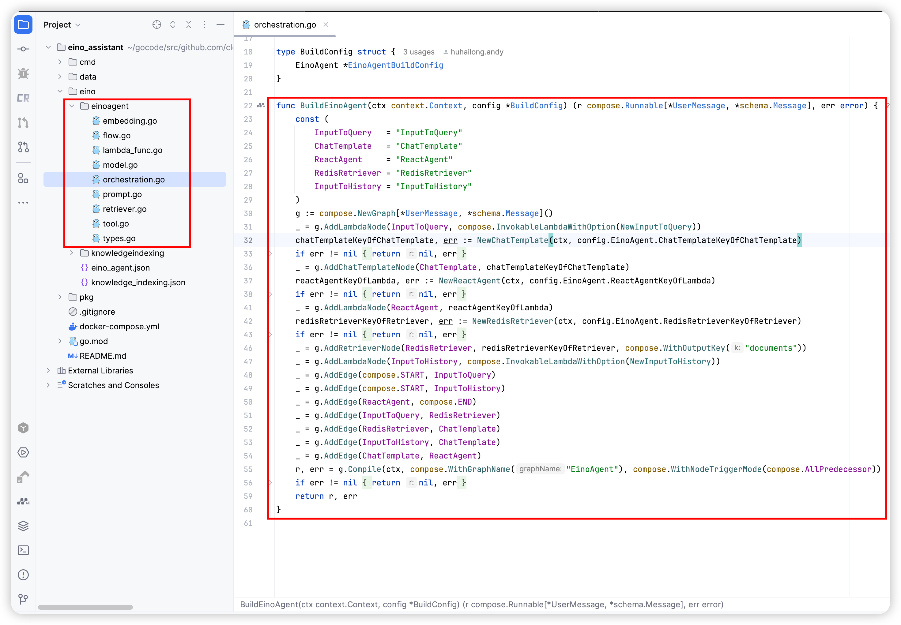 Once the configuration content for the components is supplemented, you can call the BuildEinoAgent method to use it in the business scenario.