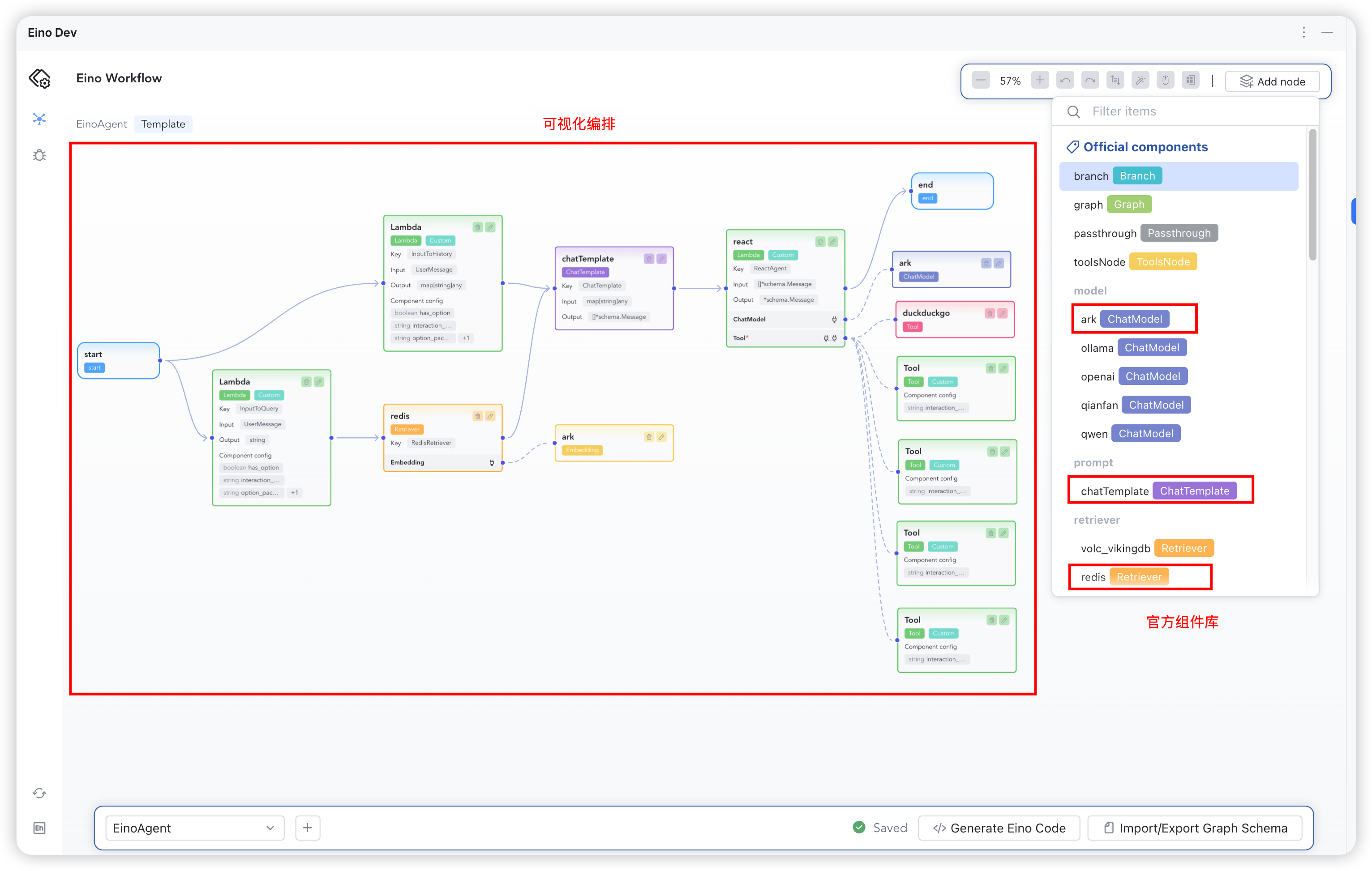 1. Open the EinoDev plugin, navigate to the Eino Workflow page, and create a new canvas. - Graph Name: EinoAgent - Node Trigger Mode: Trigger after any predecessor node finishes - Input Type Name: *UserMessage - Input Package Path: "" - Output Type Name: *schema.Message - Output Import Path: github.com/cloudwego/eino/schema - Leave other fields blank 2. According to the process description in the previous section "**Eino Agent**", select the component library needed from Eino Workflow. The following components are used in this document: - lambda: Converts any developer function func(ctx context.Context, input I) (output O, err error), into an orchestrable node. In EinoAgent, there are two conversion scenarios: - Converts *UserMessage messages into a map[string]any node for ChatTemplate - Converts *UserMessage into the input query for RedisRetriever - retriever/redis - Retrieves and returns context related to the user Query based on semantic relevance from the Redis Vector Database, in the form of schema.Document List. - prompt/chatTemplate - Constructs a Prompt template using string literals, supporting text and message placeholders, and converts any map[string]any input into a Message List that can be directly input into the model. - flow/agent/react - Based on the ChatModel provided by the developer and callable toolsets, automatically decides the next Action in response to user queries until a final answer can be generated. - model/ark - The Ark platform provides LLMs capable of completing conversational texts, such as the Doubao model. This acts as a dependency injection for the ReAct Agent. - Callable tool list - Internet search tool (DuckDuckGo), EinoTool, GitClone, TaskManager, OpenURL 3. Arrange the selected components according to the desired topology. After arranging, click "Generate Code" to the specified directory. - In this example, the code for the "**Eino Agent**" is generated to: eino/einoagent - This example can quickly be constructed by copying the Graph Schema from eino/eino_agent.json