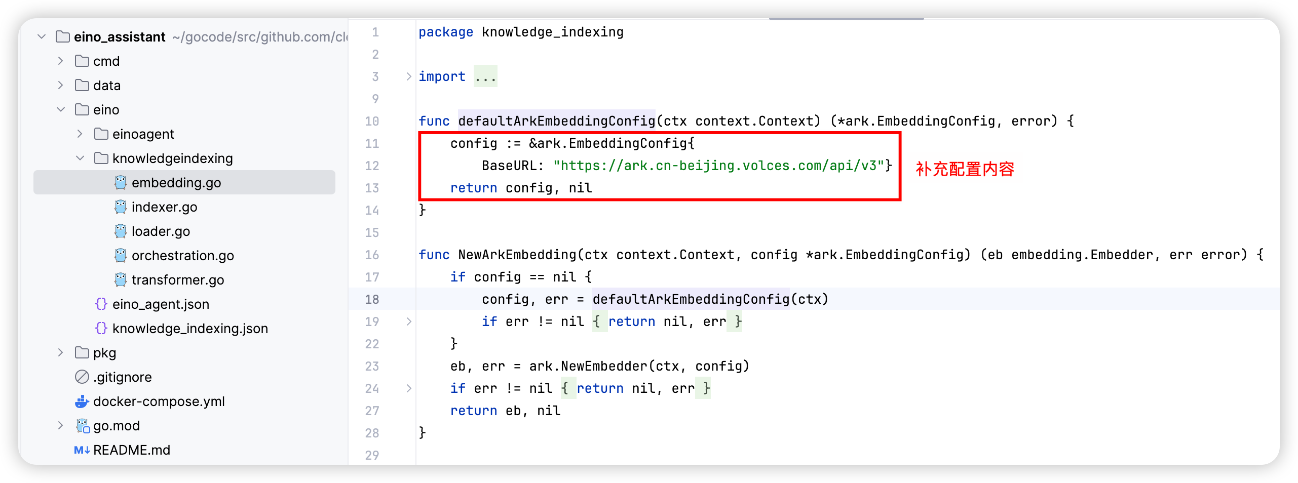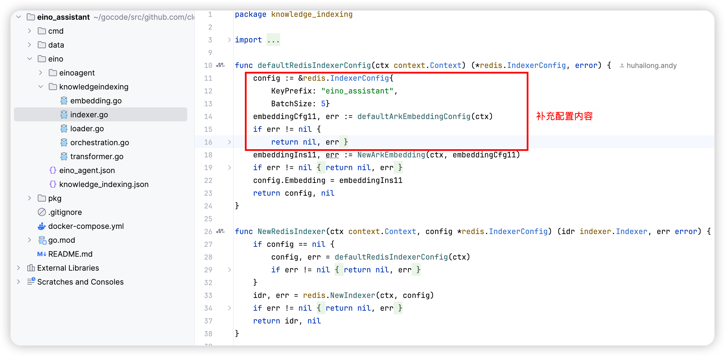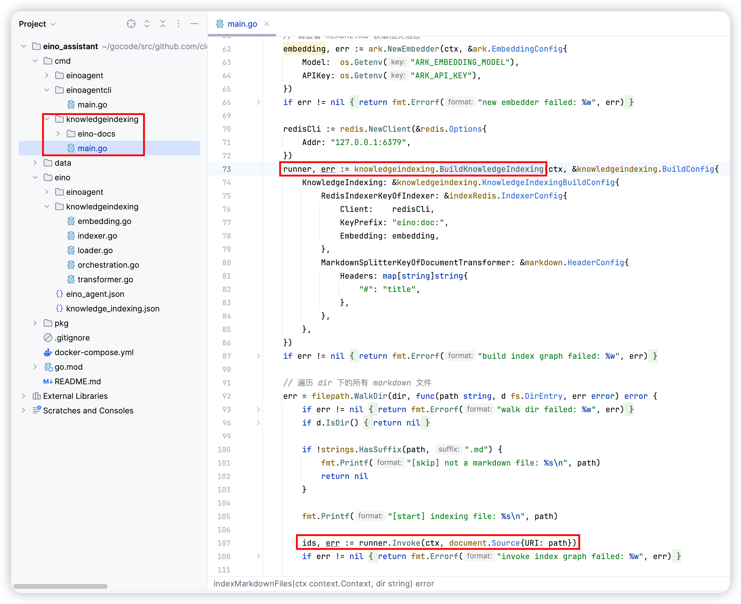 - The code for “Index Knowledge Base” is generated to: eino_assistant/eino/knowledgeindexing