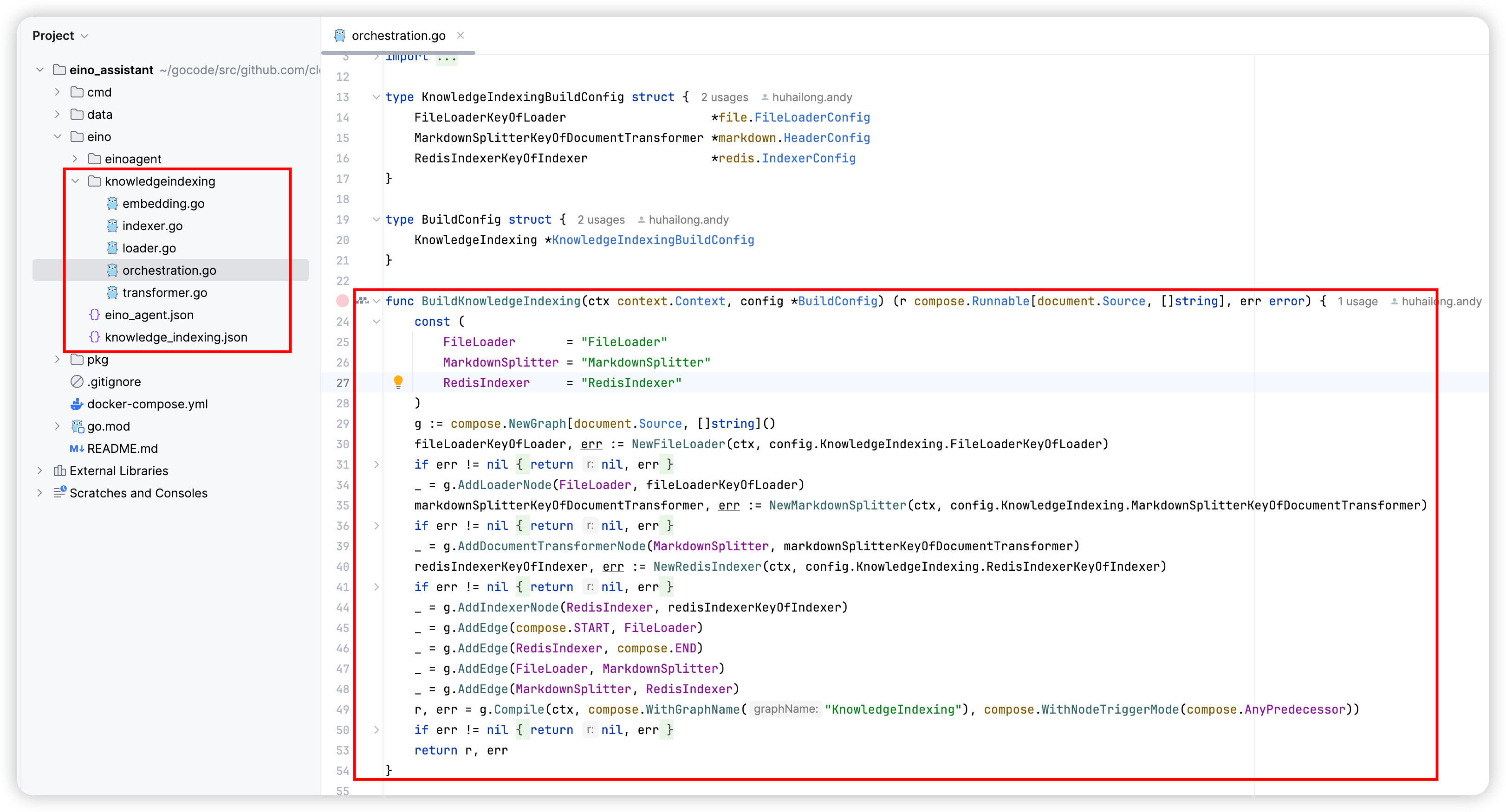 After the code is generated, first manually complete the construction methods of each component in this directory, and then call the BuildKnowledgeIndexing method in the business scenario to build and use the Eino Graph instance.