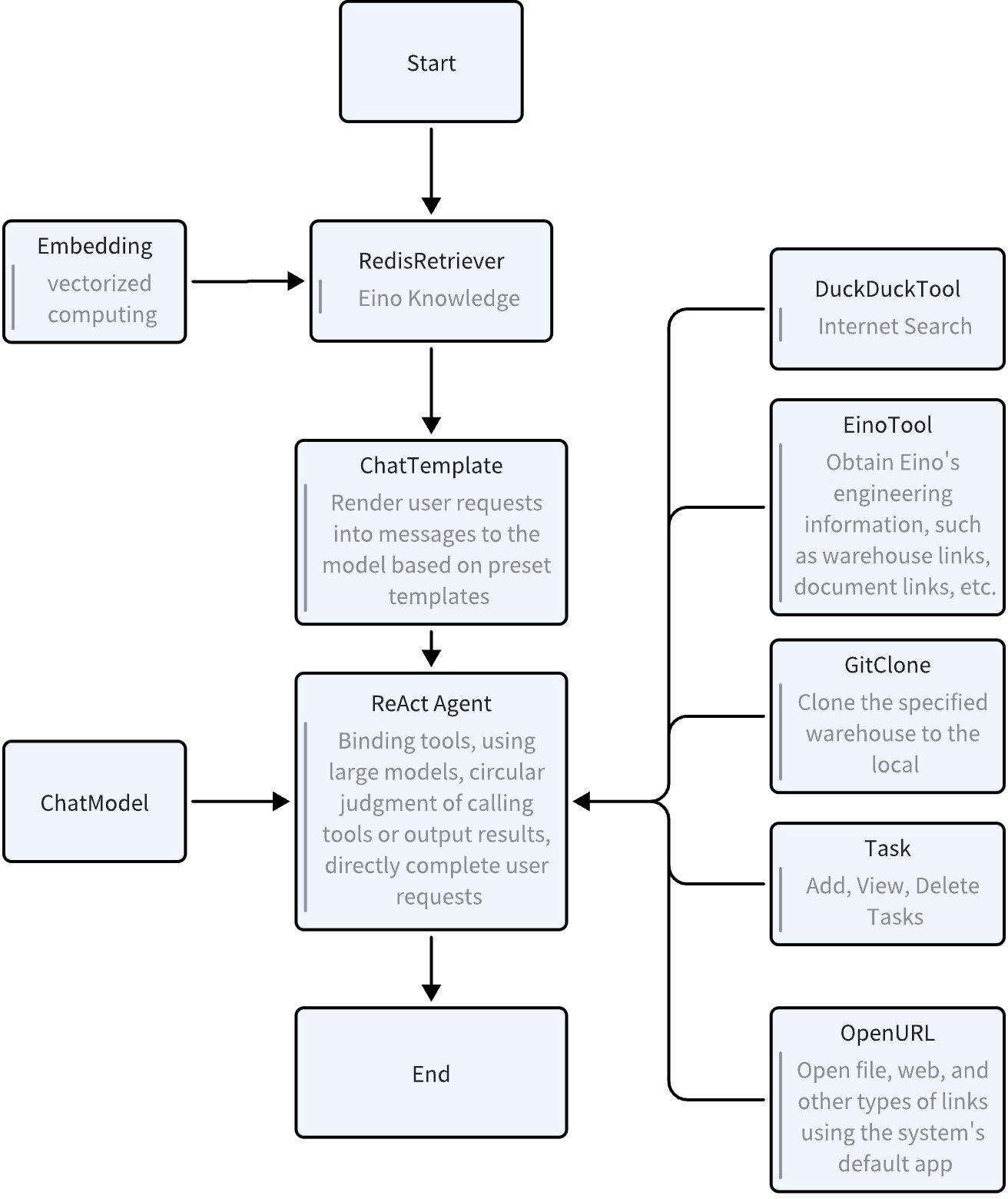 Retrieve information from the Eino knowledge base in response to user requests, construct messages using the ChatTemplate, request the React Agent, and loop through the corresponding tools as needed until the user’s request is processed.