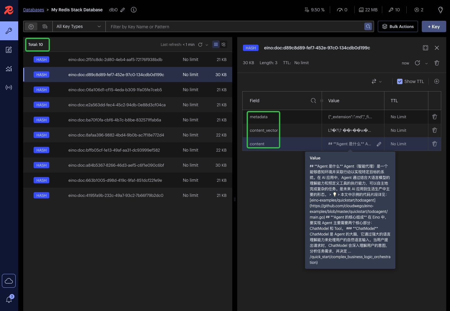 Once the execution is successful, the construction of the Eino knowledge base is completed, and you can see the vectorized content in the Redis Web UI.