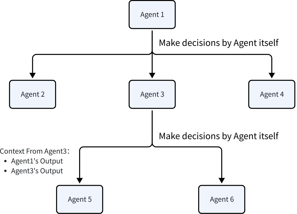 预设决策 | 事先预设好一个Agent 执行任务后的下一个 Agent。 Agent 的执行顺序是事先确定、可预测的 |